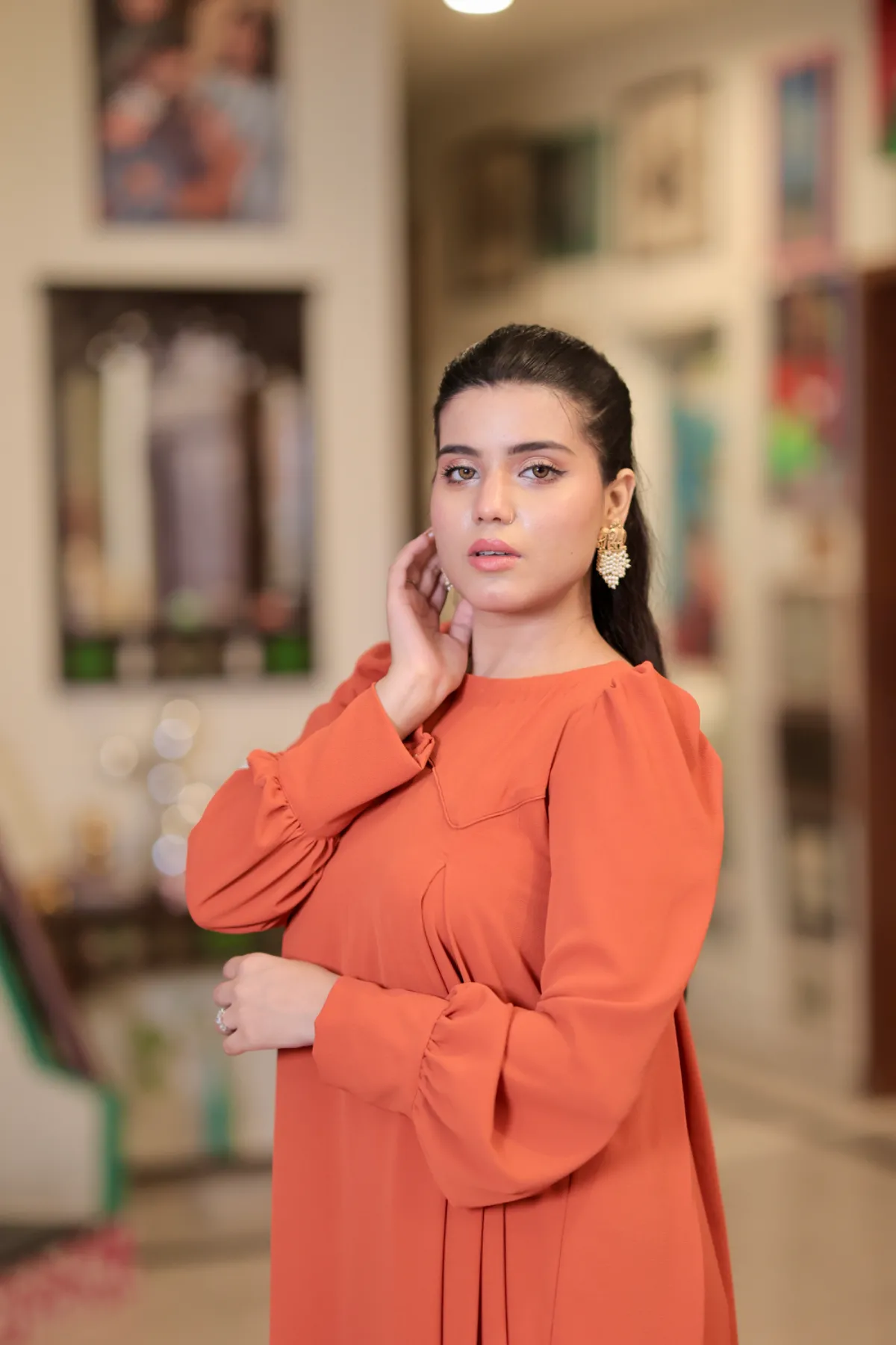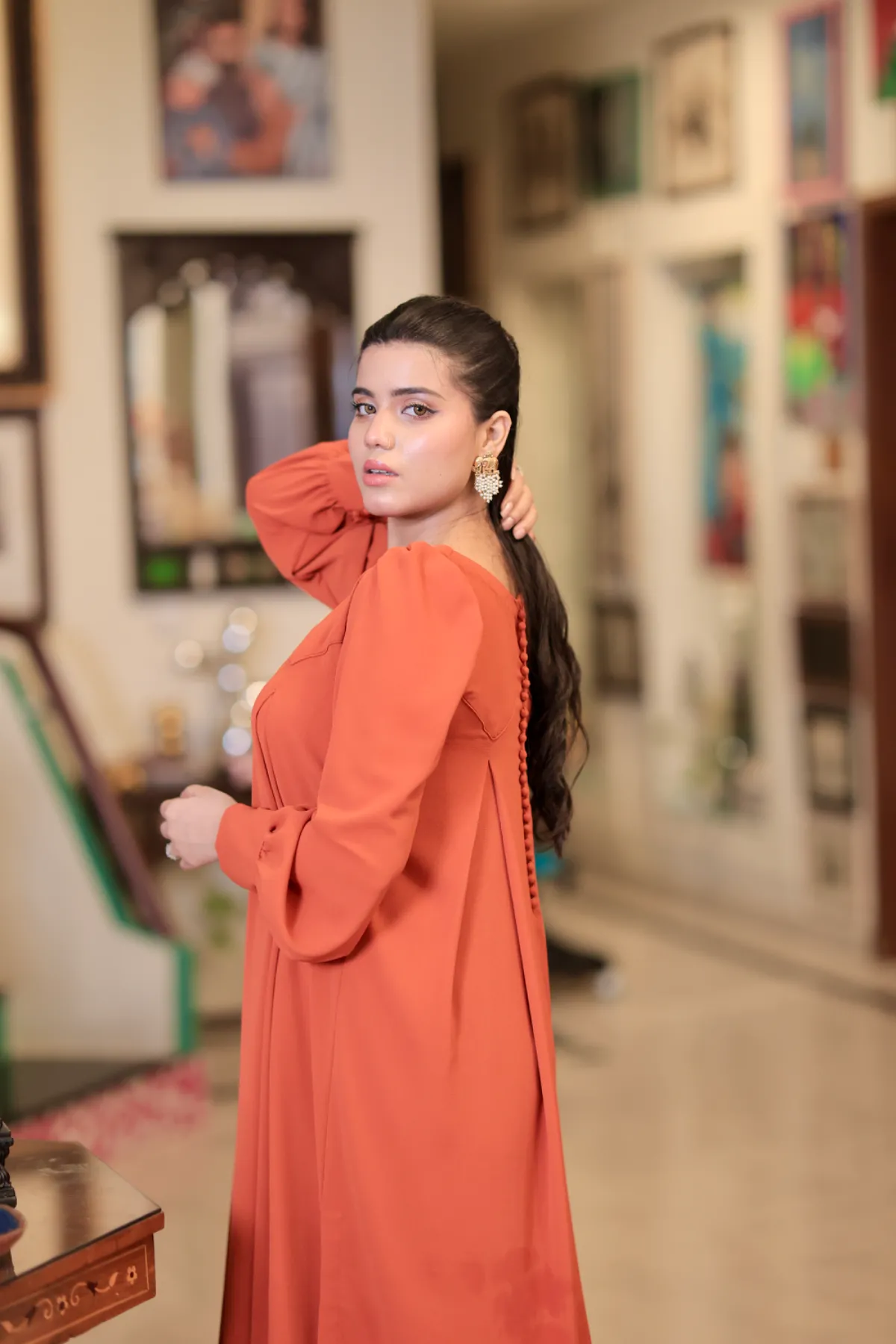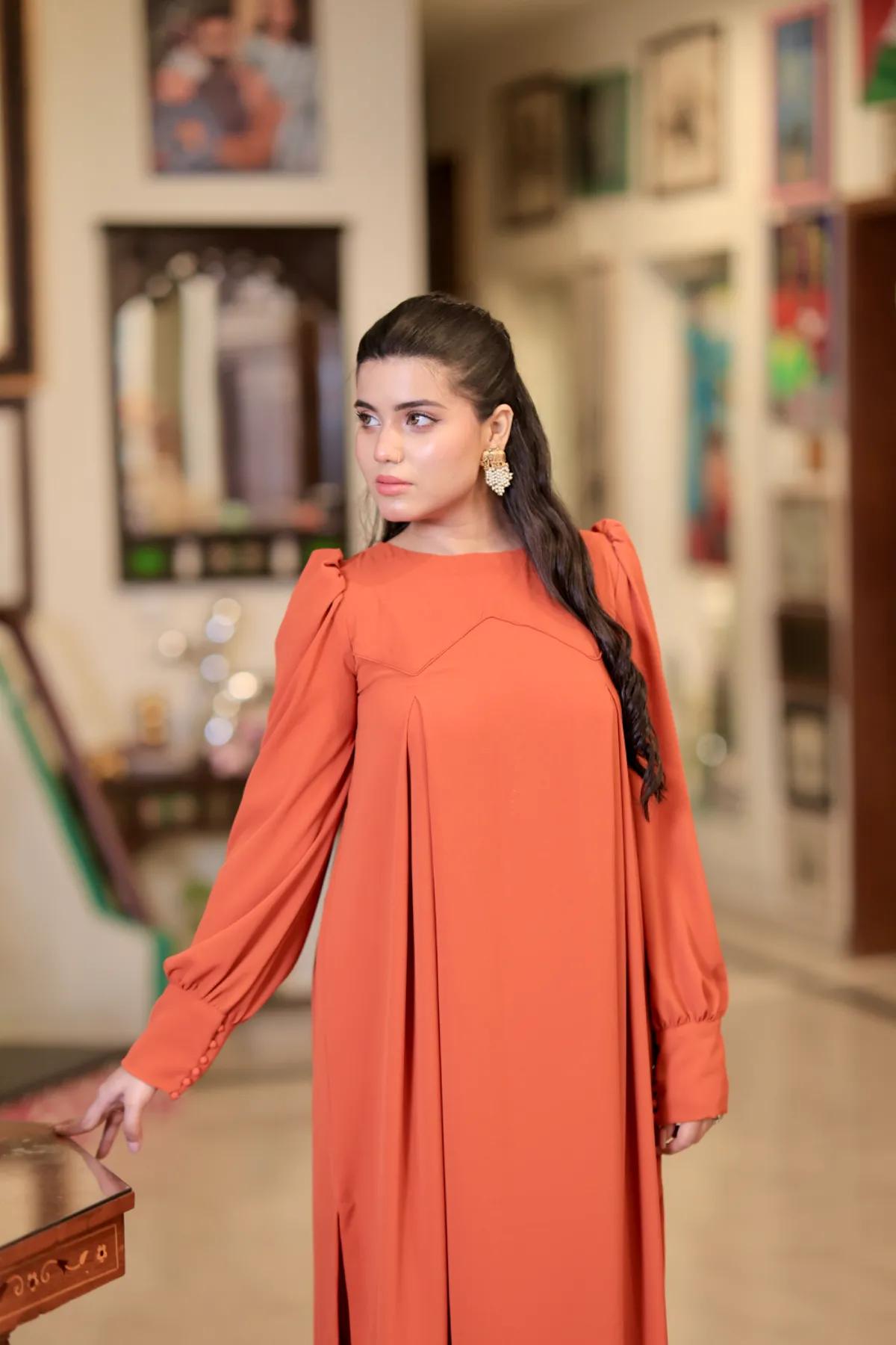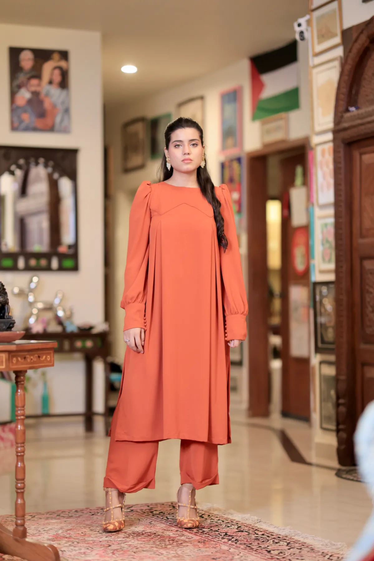 We present our hand-picked Rust Crepe Ensemble inspired not only to be worn but also felt. This appearance was carefully designed to suit women who value elegance, moderation and stature. It is a hand-embossed crepe material with a hint of fluidity, but a sophisticated form rather than stuffiness. Balloon sleeves will translate to whisper drama – full, but devoid of weight. Front and back box pleats softly outline your figure with sleek, refined geometry. The detail of the back button is a tribute to discreet glamour- because the back of clothing ought to be lovely too as the front. Combined with full trousers, this ensemble pairs fluidity with strength-offering you an unfussed length, ease, and confidence.